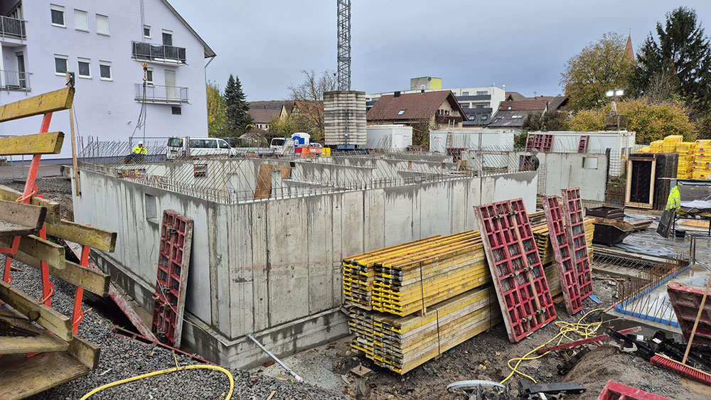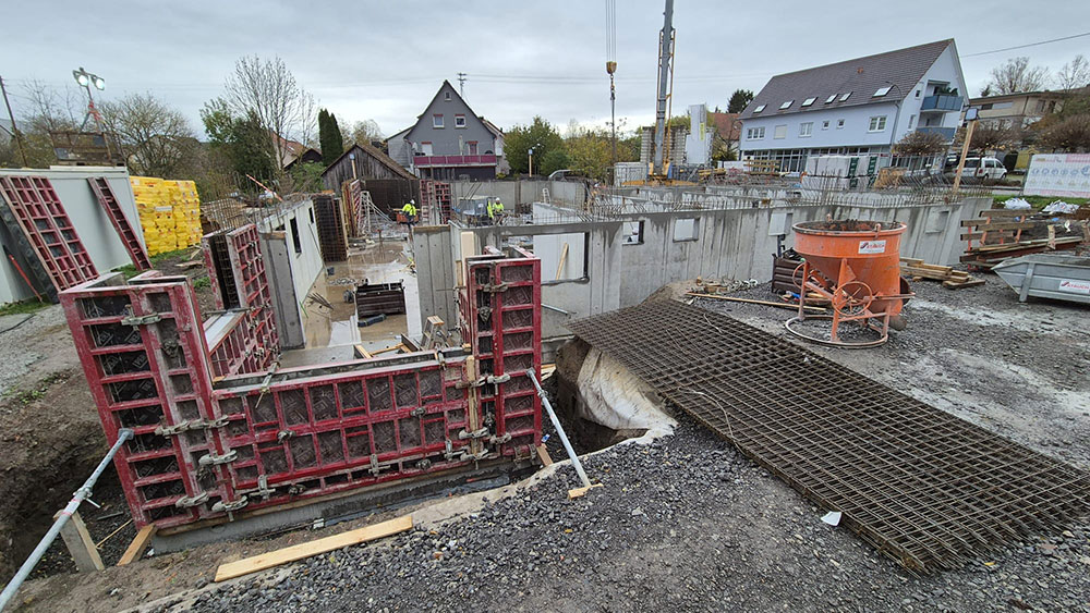 Das Bauvorhaben schreitet gut voran, derzeit werden die Umfassungswände im Untergeschoss erstellt, anschließend die Arbeitsräume verfüllt und die Decke über dem Untergeschoss betoniert. Dann ist auch schon der gesamte Baukörper zu erkennen.